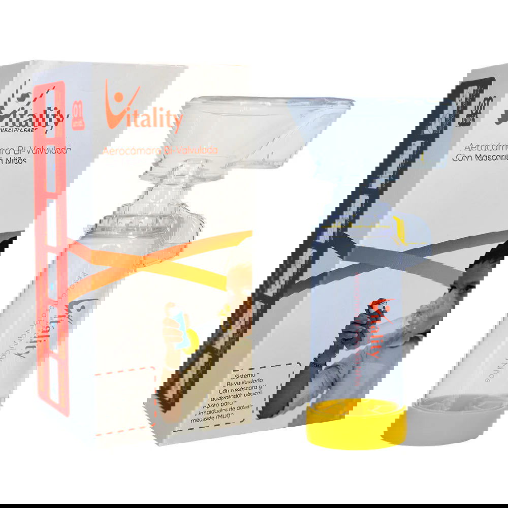 La aero cámara infantil Vitality bi valvulada facilita la óptima inhalación del medicamento para el tratamiento de enfermedades respiratorias en niños. El sistema bi valvulado de la aero cámara permite que la inhalación y exhalación se logre correctamente sin interrumpir el flujo de aire logrando que el medicamento llegue directamente a los pulmones del paciente de forma segura.