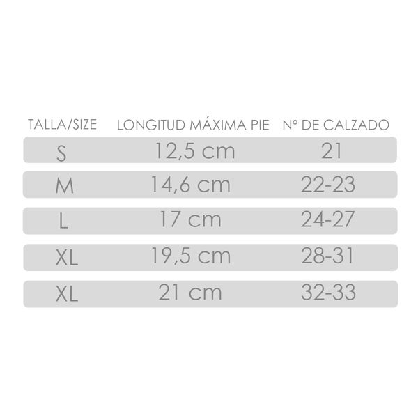 | Talla | S (21), M (22-23), L (24-27), XL (28-31), XXL (32-33) |