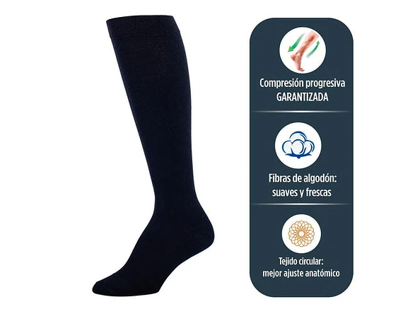 Su tejido circular con fibras de doble recubrimiento garantiza la compresión progresiva, elasticidad y durabilidad.