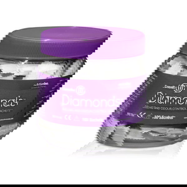 Diamonds ™ sachets Gelificantes con ActiveOne™ Control de Olores solidifica el contenido líquido y ayuda a reducir o eliminar el exceso de gas en las bolsas de Ostomía, dando a la bolsa una apariencia más plana y por lo tanto, más discreta.