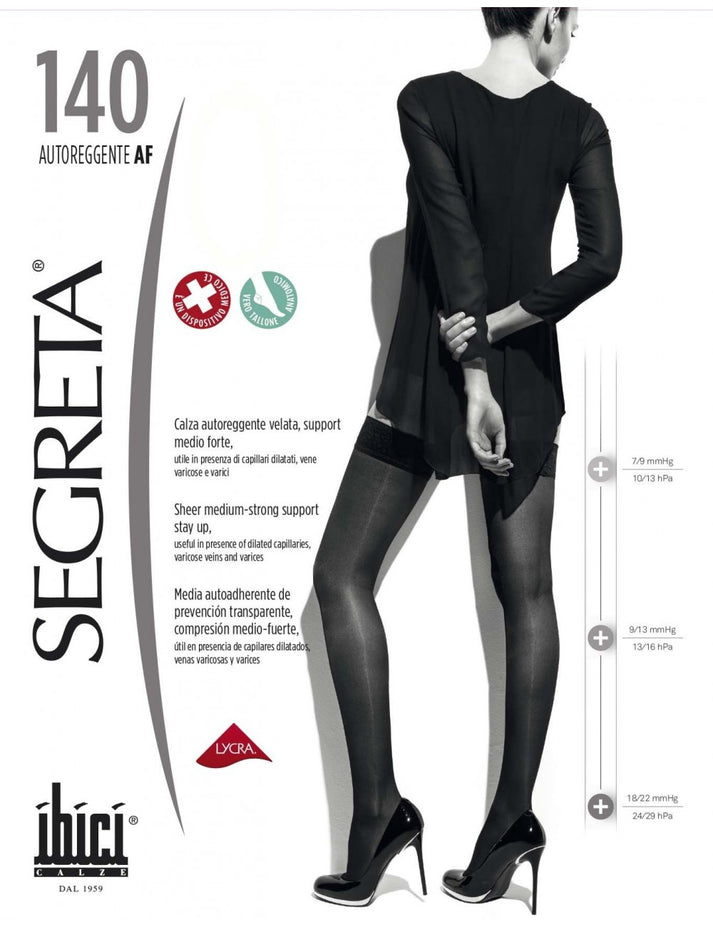 La Panty al Muslo Ibici Segreta 70 Denier es ideal para la prevención y tratamiento de várices. Gracias a su compresión graduada de 11-14 mm/Hg que mejora el retorno venoso. La compresión graduada ejerce un micromasaje estimulando la circulación de la sangre en las piernas. Aconsejable para hinchazón de tobillos, pesadez en las piernas y viajes.