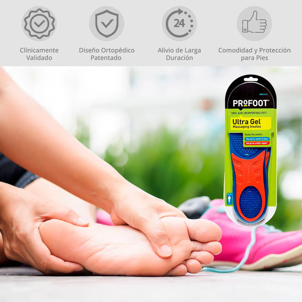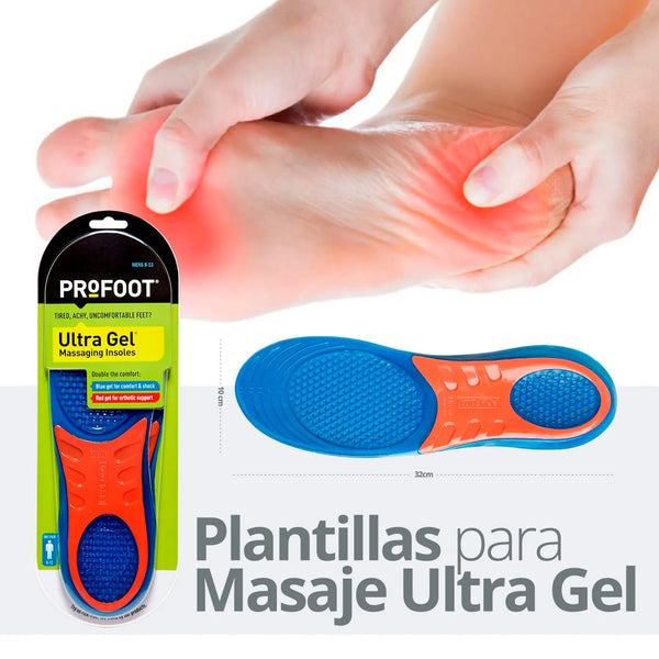 Las plantillas Ultra gel ortopédicas Profoot de masaje ofrecen doble comodidad con su innovador diseño de doble capa de gel. Además de ser increíblemente cómodas, estas plantillas devuelven energía con cada paso, ayudando a combatir el dolor y la fatiga. La capa roja brinda soporte al talón y arco, mientras que la capa azul ofrece comodidad y protección contra impactos.